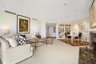 Stunning light filled condo in the exclusive luxury Beverly Hills full service IV Seasons Condominiums located on a quiet tree-lined street off of Burton Way. East facing unit with wonderful tree top and city views. Enter the marble foyer to find large light filled rooms and open floor plan with 2 bedroom, 2 and a half baths plus den. The wonderful layout and flow is designed for gracious living and entertaining features grand living room with fireplace that leads to good sized balcony, dining room and den/tv room with bar. Crown moldings, custom built-ins and book cases, plantation shutters, tall windows throughout and recessed lighting. Fabulous big primary suite with built-ins, book cases lends itself to include a sitting area, has abundant closet space that includes two walk in closets plus. Very spacious primary bath with dual sinks and vanity areas, built-ins, makeup vanity, walk in shower and jetted tub. Spacious kitchen and breakfast area with pantries and lots of storage. Make this your dream home. The building is known for it's premier services and staff, including full time concierge, doormen, valet parking, pool, spa, gym and extra storage. Enjoy a terrific lifestyle, in this prime close to all, Beverly Hills location!
